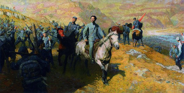 汤沐黎,《转战南北——抗战中的毛泽东与周恩来》,布面油彩,118×232.2cm,1977,龙美术馆