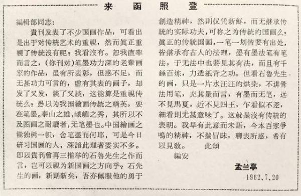 1962年《美术》杂志第4期上刊登的孟兰亭(化名)的来信
