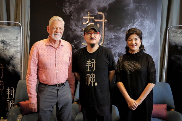 《封神三部曲》主创合影:制作顾问巴里·M.奥斯本、导演乌尔善、制片人杜扬