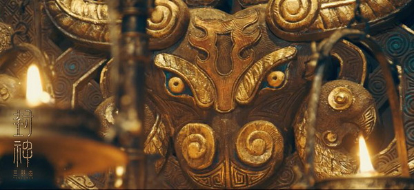 内景中的木雕建筑和青铜器摆件颇见《封神三部曲》剧组的匠心,所有道具并不是“比葫芦画瓢”,原样复刻历史上商周的器皿,而是剧组参考商周文化元素再度创新制作的。“工序是先由毕业于清华美院、中央美术学院等高等艺术院校的泥雕艺术家根据美术团队的设计稿做出泥雕,再由安徽歙县和浙江东阳的木雕师进行1:1大小的木雕打样,然后进行大批量玻璃钢、发泡翻制,最终使用贴金的方式,对雕件进行效果处理。”房英春介绍说剧组置景工人最多时有1500人,“其中木雕工就有800人”。由于电影将全部采用8K摄影机高清拍摄,乌尔善对场景和道具的要求是“达到博物馆典藏级”。制作顾问巴里·M.奥斯本表示:“《指环王》拍摄结束以后,道具和电影里面运用的刀、剑都成为了展品,在全球范围内办了一个博物馆类的展览。这对《封神三部曲》也是一个借鉴,希望这里的道具拍完之后可以做类似的事情。”