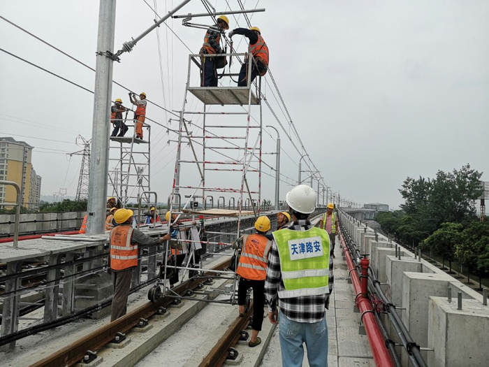 为了高效完成接触网“热滑”工作,组织参建单位精心筹划、优化组织方案,采用了2列电客车同时进行“热滑”,通过科学组织,将热滑时间缩短一半。