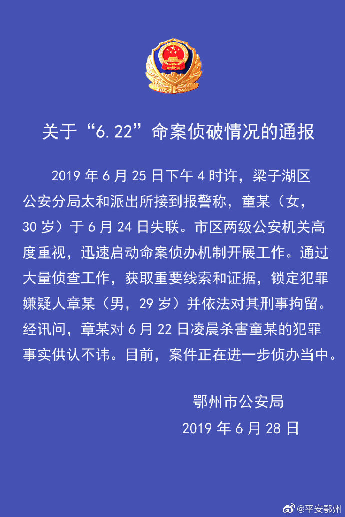 6月28日,湖北省鄂州市公安局官方微博@平安鄂州 发布关于“6.22”命案侦破情况的通报称,6月25日下午4时许,梁子湖区公安局太和派岀所接到报警称,童某(女,30岁)于6月24日失联。警方经过大量侦查工作,锁定犯罪嫌疑人章某(男,29岁)并依法对其刑事拘留。经询问,章某对杀害童某的犯罪事实供认不讳。目前,案件正在进一步侦办当中。