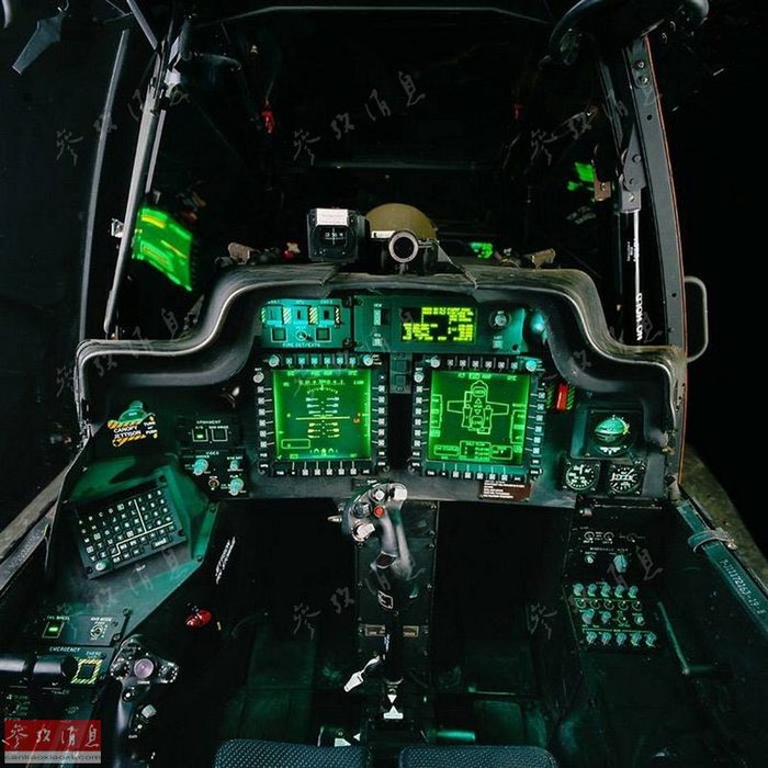 图为AH-64D的飞行员座舱,仪表布置更为紧凑一些,除了常规仪表外,可以注意左下角的小键盘(炮手座舱也有),这个是供飞行员和炮手进行数据和资料交换用的,也可以用于飞行员或炮手向僚机或后方指挥部传送信息。