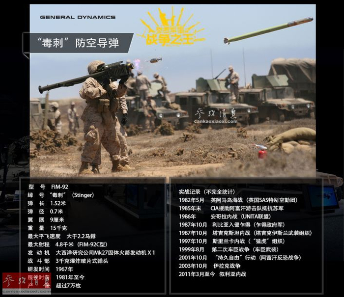 “毒刺”导弹最初由美国通用动力公司于1967年研发,雷锡恩公司负责制造,自1981年服役至今已成为单兵肩扛式防空导弹的代名词,其采用红外制导,最大有效射程8千米。“阿帕奇”使用的是AIM-92空射型。图为2009年7月,美海军陆战队士兵试射肩扛式FIM-92A“毒刺”导弹资料图。
