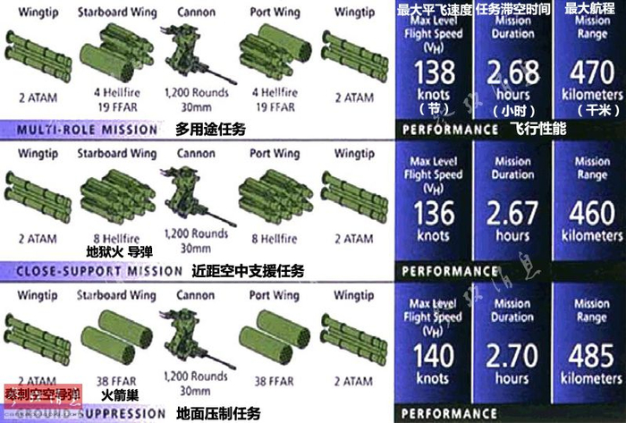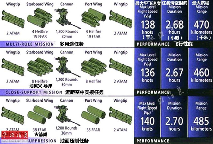 图为美陆军官方公布的AH-64D执行三种不同作战任务的武器配置和性能示意图,可见在500千米的作战半径内,AH-64D的平均滞空时间可达到2.7小时。