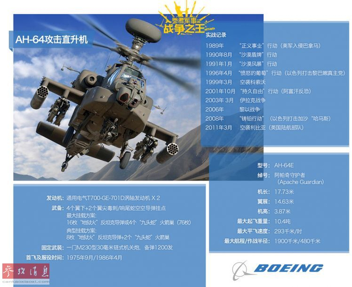 “阿帕奇”系列武直对军迷们来说早已是如雷贯耳的名字,这种于1986年投入服役的经典武直,曾打响了1991年海湾战争“沙漠风暴”行动的第一枪(8架AH-64在4架MH-53特种直升机的引导下,超低空渗透进入伊拉克南部,用“地狱火”导弹摧毁了伊军远程雷达站)。之后还在多场局部战争中有过出色表现,本图列举了“阿帕奇”的相关详细信息。