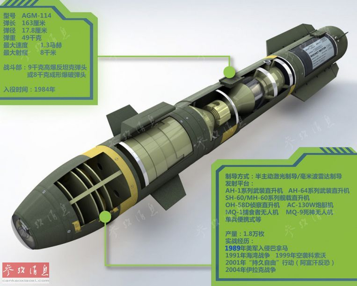 这种由洛克希德 马丁公司研发的反坦克导弹,最初能名声大震,也是多亏了与“阿帕奇”的组合。1989年美军入侵巴拿马是这一组合首次实战,美军指挥官的评价是,“AH-64可以用‘地狱火’导弹击中8千米外的一扇窗户。”,可见其命中精度之高。