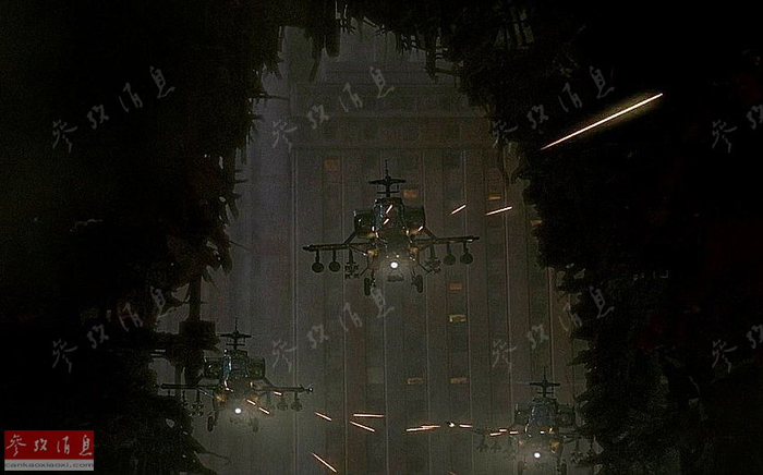 后来“阿帕奇”逐渐成为了银幕上的“常客”,另一次印象深刻的“酱油”是在罗兰·艾默里奇导演的1998年版《哥斯拉》中,以大机群组成的“阿帕奇”空中猎杀部队给人留下了深刻印象,虽然大多以悲剧收场。或许是出于剧情需要,为了猎杀怪兽,片中的AH-64明显经过了重武装改进,M230链式机炮换成了并列在机头两侧的大口径机炮,短翼的4个挂点也扩增为6个。
