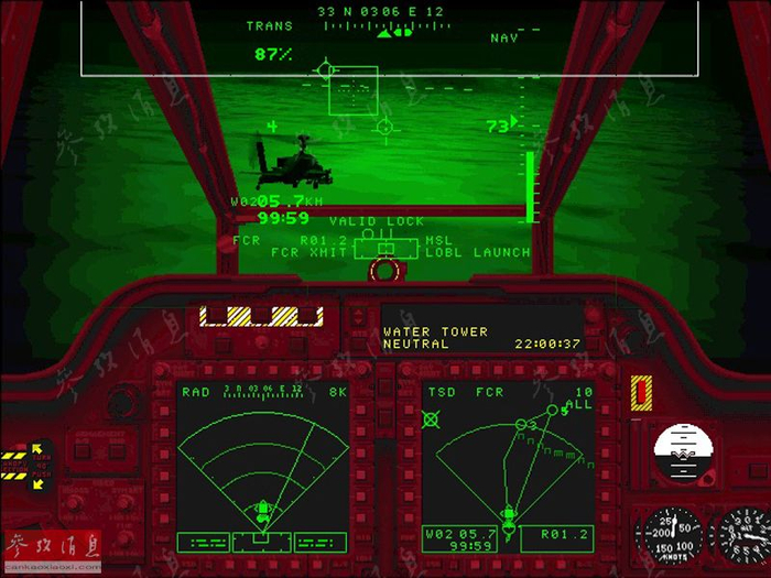 虽然今天看来,这两作的游戏画面十分原始,但在当时已是轰动级效果,特别是由于游戏内容由简氏防务集团监督,在装备拟真度方面,达到了空前的高度。图为《长弓2》中的AH-64D飞行员座舱仪表视角,完整还原了现实中的各种细节。