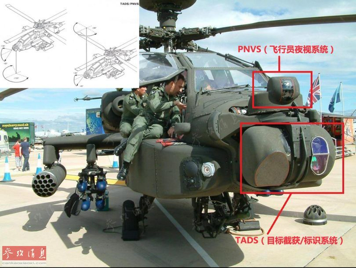 “阿帕奇”的飞行员和炮手能够获得精准图像和进行目标锁定攻击都要得益于图中的两大观瞄系统PNVS和TADS。图为英国陆军的 WAH-64D (基于美军AH-64D Block1改进而来),小图分别为两种传感器的扫描范围示意图。