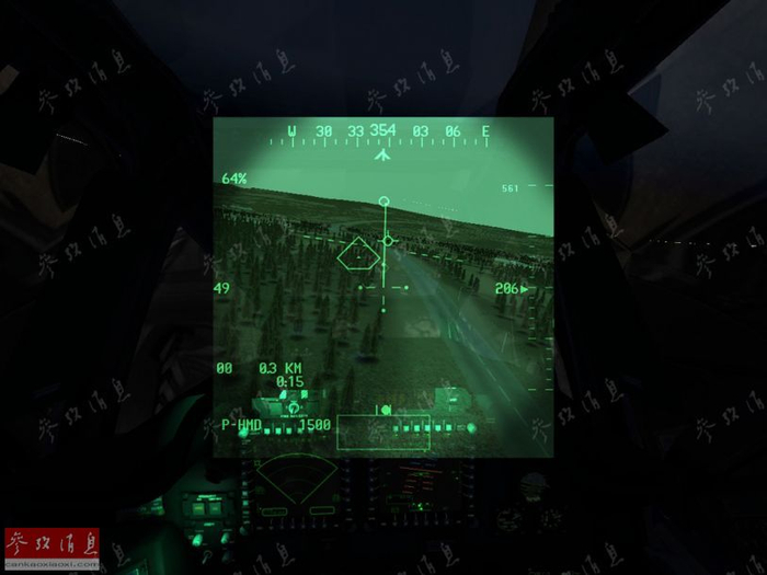 图为军事模拟游戏《武装突袭2》中,“阿帕奇”飞行员利用PNVS夜视系统,看到的夜视飞行图像,虽与现实中的略有差异,但已十分相似。