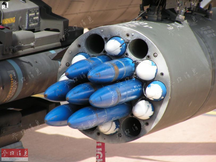 AH-64的第二大“杀器”为“九头蛇”(Hydra)70系列70毫米航空火箭弹。该系列火箭弹可选用多种战斗部,其中M229高爆弹头载有2.2千克炸药,有效射程8千米,最大射程1万米。通常使用19联装火箭巢搭载,一架AH-64最多可挂4个火箭巢,共76枚火箭弹。
