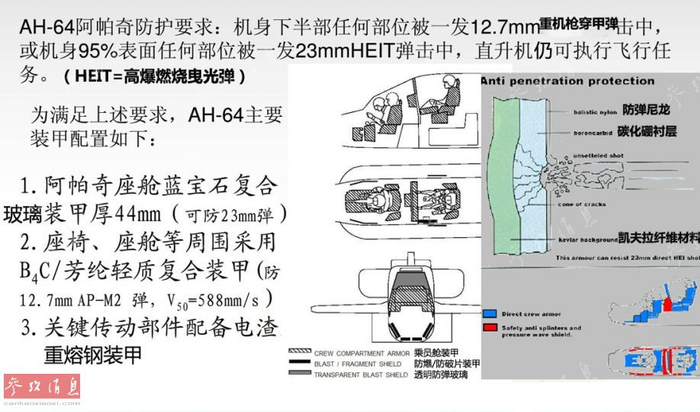 为应对敌方的低空防空火力,“阿帕奇”机身采用了完备的装甲防护系统(全机身装甲重1.1吨)以及自密封油箱(被命中后不会漏油),乘员舱和旋翼都可抵挡一发23毫米高爆弹直接命中。即使坠毁时,起落架也能吸收大部分能量,保护机组人员。图为AH-64装甲防护示意图,最右小图为“阿帕奇”三重装甲防弹保护层原理示意图。