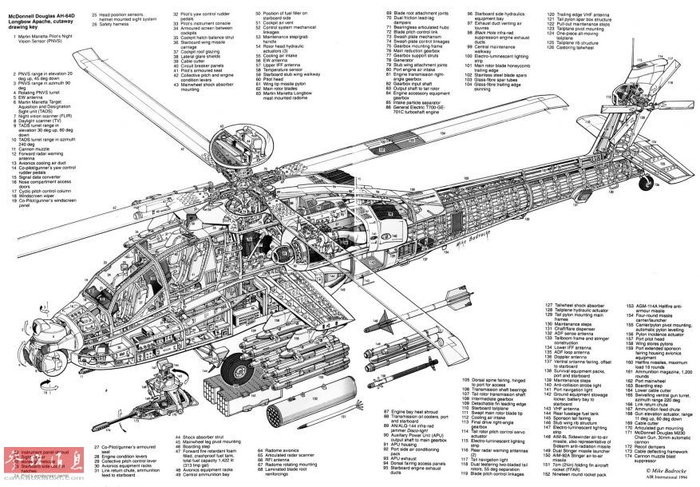 作为美军现役主力攻击直升机,“阿帕奇”在汲取AH-1“眼镜蛇”的作战经验的基础上,采用了许多经典设计,但又有很多创新之处。 图为AH-64D结构图。