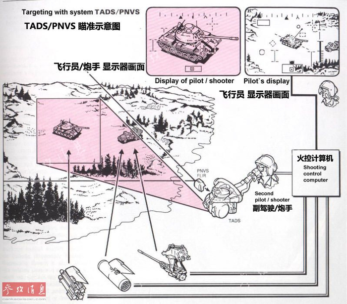 借助两大系统,飞行员和炮手可同时分别瞄准和攻击不同种类的目标, 图为”阿帕奇“观瞄系统工作原理示意图(图片来源:空军之翼)。