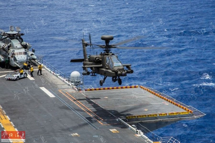 美陆军后来也进行了多次“阿帕奇”舰载测试,结果也取得成功,这意味着在战时需要时,可以临时将“阿帕奇”部署到水面舰艇作战。图为2014年7月,美陆军一架AH-64E在巴丹号两栖攻击舰上降落。