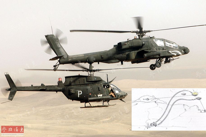 图为AH-64攻击直升机与OH-58D观测直升机编队飞行。小图为AH-64A使用AGM-114A激光制导型“地狱火”导弹作战示意图,正如图中所示,”地狱火“导弹通常采用抛物线“攻顶”弹道打击装甲目标,使AH-64可以躲在山丘后方(不暴露自身)发射导弹,只是需要OH-58D观测直升机利用桅顶瞄准具提供激光制导。这一组合在1991年的海湾战争中取得不俗战绩。在AH-64D服役后,逐渐取代了OH-58D的位置。