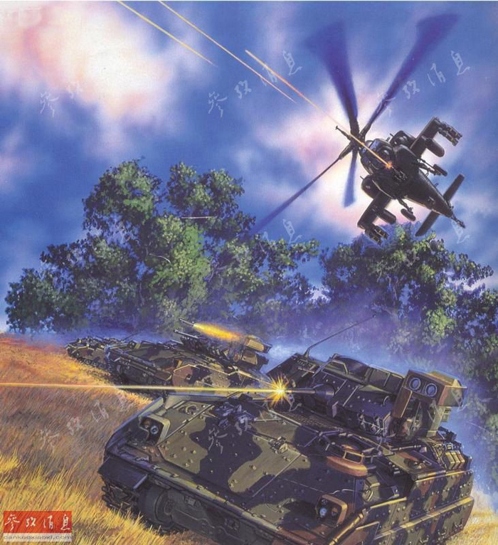 图为艺术家绘制的AH-64与M2步兵战车进行空地协同作战的场面,巧合的是M2步战车的主武器也是M230链式机炮,可与AH-64通用弹药。