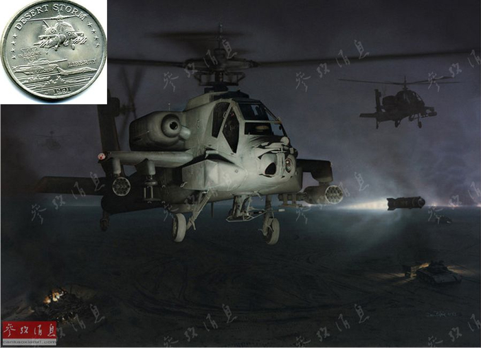 1991年1月17日凌晨,“沙漠风暴”空袭行动前22分钟,8架AH-64在4架MH-53特种直升机的引导下,超低空渗透进入伊拉克南部,用“地狱火”导弹摧毁了伊军两座远程雷达站,打响了海湾战争的第一枪。鉴于这一特殊贡献,在美军战后发型的“沙漠风暴”行动纪念币上,可以看到“阿帕奇”的所占比重之大。据美军统计,整个海湾战争期间,AH-64机群共摧毁了278辆伊军坦克和装甲车。