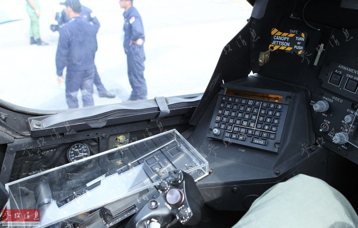 图为2012年新加坡航展上拍摄的AH-64D飞行员座舱的小键盘特写,其上方的黑黄色装置是座舱盖紧急弹射开关。