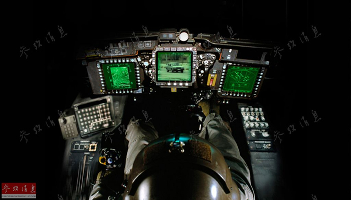 图为AH-64D“长弓阿帕奇”的炮手(副驾驶)座舱,除了左右两块多功能显示器外,中间还有一个M-TADS/PNVS(现代化目标截获照射瞄准具/夜视传感器)的传感器显示器,可为炮手在夜间或恶劣天候下提供清晰的光电或红外目标图像。