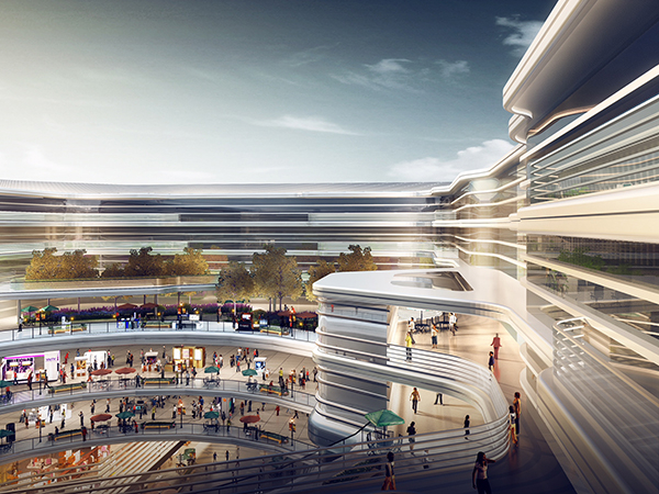 九星城项目位于闵行七宝九星核心板块,由九个地块组成,占地面积16.08万平方米(241亩),总建筑面积100万平方米。其中,地上10层,建筑面积52.83万平方米;地下2层,建筑面积47.17万平方米。建筑外立面采用行云流水的设计手法,3-5F设横跨市政道路的三层连桥,在中间地块的三、四层设净宽4米的十字连桥,利用4个环形剪刀坡道与2条直达三层的直行坡道以及地上停车库、屋顶停车场,形成地上车行系统,实现“层层首层”的商业设计理念。