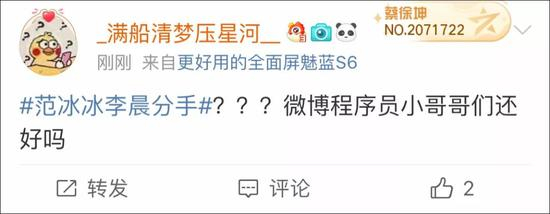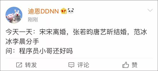 网友还没从早上韩国“双宋离婚”的震惊中反应过来,晚上又得知范冰冰李晨分手的消息,不由感叹“今天是个分手的日子”,同时也关心:程序员小哥哥们还好吗。。。
