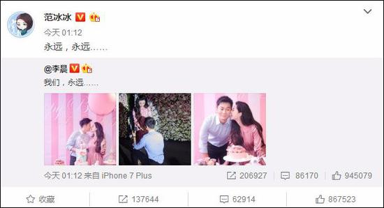 2017年9月16日凌晨,李晨宣布求婚成功,配文称:“我们,永远……”,范冰冰随机转发并评论道:“永远,永远……”。