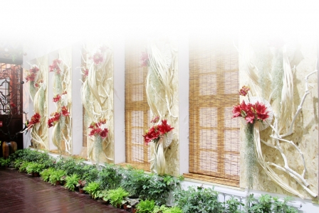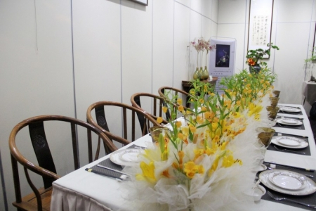 本次插花花艺展最大的亮点,莫过于将中国传统的诗词与插花作品,有机地结合在了一起。为花展“锦上添花”的诗文展览,让人们在花香沁人心脾的同时,也能从吟诗赏文中,获得别样享受。“多年以来,我看过无数次的展览。从北京、上海,到辽宁、广东、河南、西安……但是,当杜老师说,在文瀛公园的书画展厅里,她想让花与书法实现有机的结合,我毫不犹豫地答应了。”此次插花展中,姚奠中先生弟子、山西省书协理事梁桐寿先生,为插花作品一一精心选择了独特的“诗词花语”。他说,目前国内还没有专门把书法和插花艺术完美结合在一起的展览形式,它不仅仅是花和书法的结合,它还是景与书法的结合。“中国书法本身是一种艺术,插花也是一种艺术。那就有机地通过两种艺术,来充分表达作者的思想、表达意境。”梁桐寿用展厅中“客厅”一角的牡丹插花,向我们阐释了“诗词花语”的别样意境:与牡丹相呼应,我写的内容是李白创作的《沉香亭·咏牡丹》。“唯有牡丹真国色”,最美的牡丹诗,非他莫属。“李白是在大唐盛世时,横空出现的诗人。”梁桐寿介绍,“云想衣裳花想容,春风拂槛露华浓。若非群玉山头见,会向瑶台月下逢。”这首诗体现了两个之最:第一个之最是大唐盛世,吟咏牡丹的最佳诗歌;第二是一个君王与他深爱的妃子,相依相恋的最佳诗作。“从牡丹的雍容华贵,我们赞美盛世、赞美爱情,花艺表达的意趣和诗词的意趣有机地结合在一起,会让人感觉意味悠长,余香袅袅。”