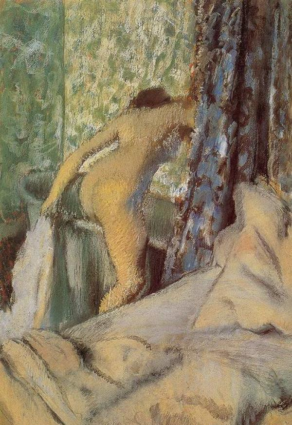 止庵在谈德加的部分认为,德加笔下的女人总被认为是冷淡的、并不美观的。他画了许多俯身的、擦身体的、弯腰的、拧毛巾的女人,“德加的浴女总是低着头、背着身,看不清她们的脸。德加不关心她们想什么,对他来说,她们的形体、姿势、动作胜于一切。”