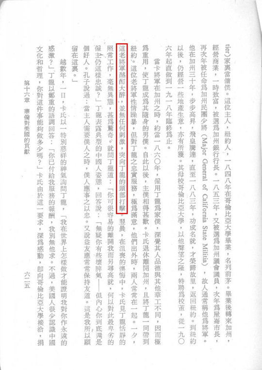 远在美国南北战争时,有一位将军退休了,寓居纽约附近,那位将军独身不娶,性情相当怪,家中仆人都被他打骂跑了。丁龙是我们山东人,只身去美国当华工,他便投到那位将军家里。不几天,那位将军脾气又发,要打要骂,丁龙受不了,也跑了。过了几天,那位将军家里失火,乱七八糟,将军独个儿正没摆布,那丁龙却回来了。将军惊喜之余,俱问所以,丁龙说:“听说你家失火,没人帮忙,所以复来。”那将军说:“前几天我要打要骂,气跑了你。今天我正在无奈之中,怎么你有肯来帮我?”丁龙道:“这因我们中国有位孔夫子是讲忠恕之道的。你平常虽带我不好,但你为人也不全坏,我想我和你总有些缘分。你此刻需人帮助,我若不来,似乎就不符合我们孔夫子所讲的忠恕之道了。”……原来他们丁家只是时代耕地,却一代代,祖教父,父教子,都讲些孔夫子的道理。将军听了,大为感动,便请他继续留下,从此主仆如朋友般,而且两人也都没结婚,竟如相依为命般。后来丁龙先病倒了,他对将军说:“我在你这里做了几十年工,吃的、穿的、住的,都由你供给,还余留有你给的工资,现在积存也有一万金。这些本都是你的钱,我死了,就把这一万金还给你,算我答谢你的厚德吧!”那位将军听了,十分感动,心想:中国一个不识字的苦工,尚有如此般的德性操守,这绝不是偶然。因此他一心敬重中国,发心要人来研究中国文化,遂把他晚年全部财产共二十几万块钱,加上丁龙的一万,送到哥伦比亚大学去,指定要设立一讲座,专来研究中国文化。这讲座便定名为“丁龙讲座”。这讲座一直到今日未中断。(《钱宾四先生全集第50卷 新亚遗铎》第347-348页)