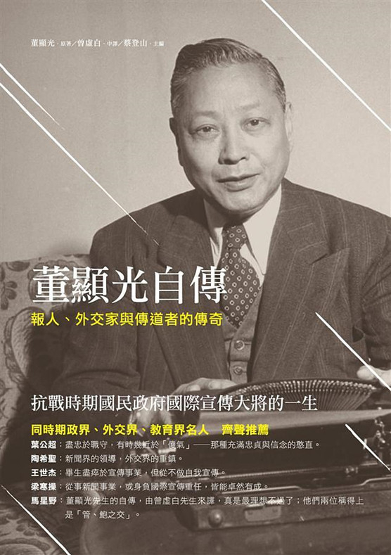 董显光(1887-1971,Hollington K.Tong),浙江鄞县人,1906在奉化龙津中学教英文时成为蒋介石老师,后赴美学习,入读密苏里新闻学院、哥伦比亚大学普利策新闻学院,回国后供职英文《中国共和日报》、《北京日报》、《密勒氏评论报》等,任《大陆报》总经理兼总编辑,1934年经蒋介石介绍加入国民党,次年起在上海负责外电检查,1937年奉蒋介石之命创办国际宣传处,随后以中央宣传部副部长身份督导国际宣传处工作,其任务就是“把中国介绍给全世界”,在向国际社会揭露日本侵华真相、传播中国军民抗战决心与成绩方面有很大贡献。1937年,董显光写成英文版《中国最高领袖蒋介石》,目的是向世界作宣传。