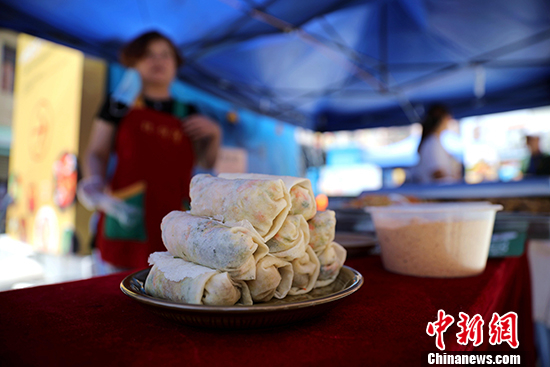 6月29日,“2019食品安全周·闽台古早味大擂台”在位于厦门沙坡尾的厦门“老字号”创新展示中心开幕,吸引两岸古早味餐饮业者现场制作美食、切磋厨艺。图为闽南传统小吃——薄饼。 中新社记者 李思源 摄
