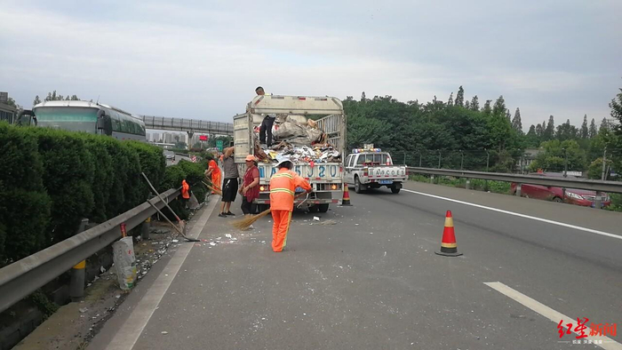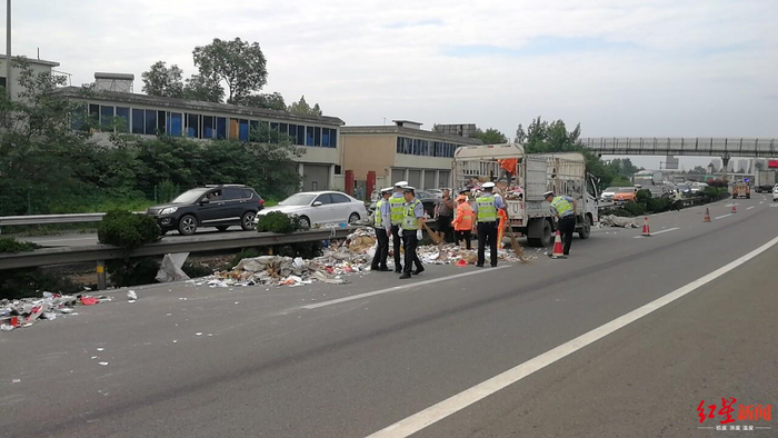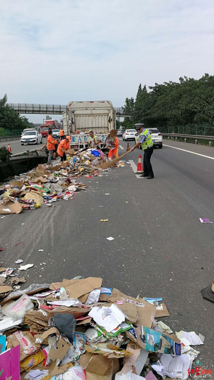 成名高速货车侧翻掉落大量纸板 路政交警30人清理4小时