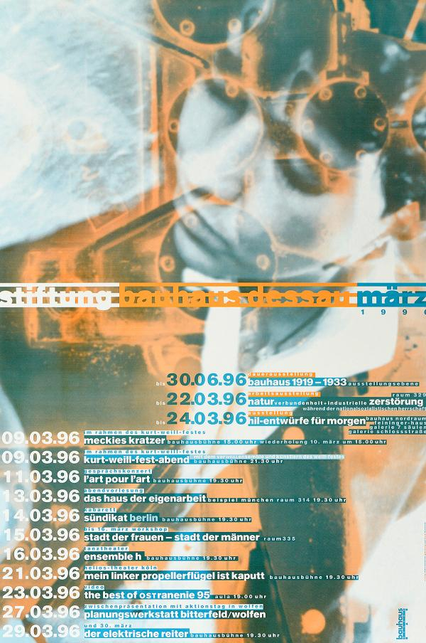 另一个规模较小的展览“墙上的设计:20世纪90年代的Cyan”,展示了Cyan设计的创造性图形作品。出生于东柏林的Detlaf Fiedler和Daniela Haufe在1989年柏林墙倒塌后不久就成立了平面设计机构Cyan,他们也是最早使用Photoshop、PageMaker等软件工具的海报设计师之一。他们为包豪斯德绍基金会(包豪斯艺术学院的现代版本)和其他文化组织制作图像,排版。这两个展览都将展至10月6日。