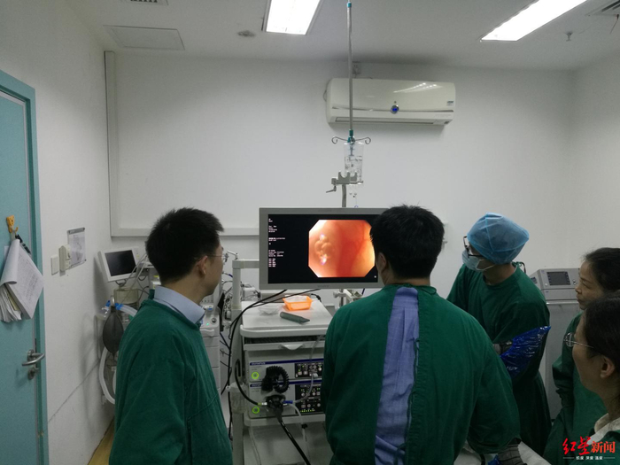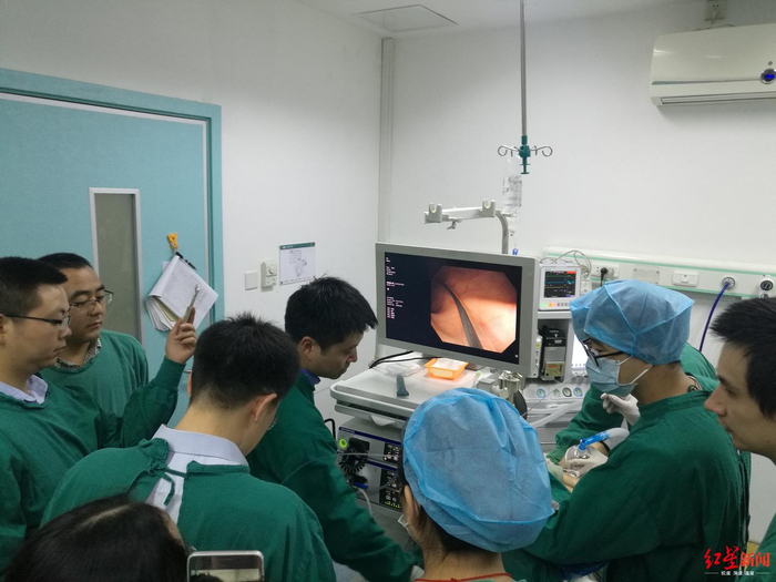 ↑吕沐瀚教授正在为患者做粪菌移植手术