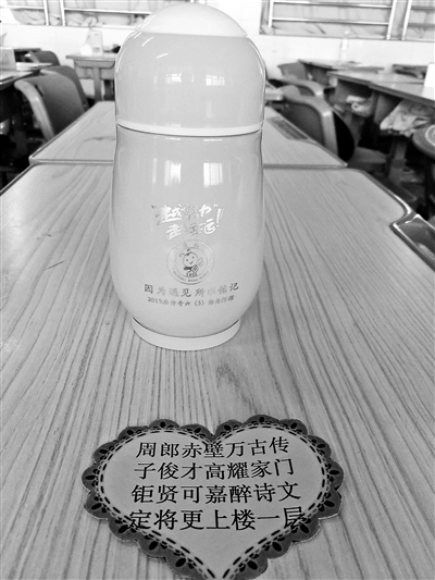 除了诗以外,郑有海还在网上购买了茶杯送给学生,杯子上印有“越努力,越幸运”。郑老师说,“杯子谐音‘一辈子’,希望学生们能一辈子记得老师,也一辈子都能够努力。”文/本报记者 郭琳琳
