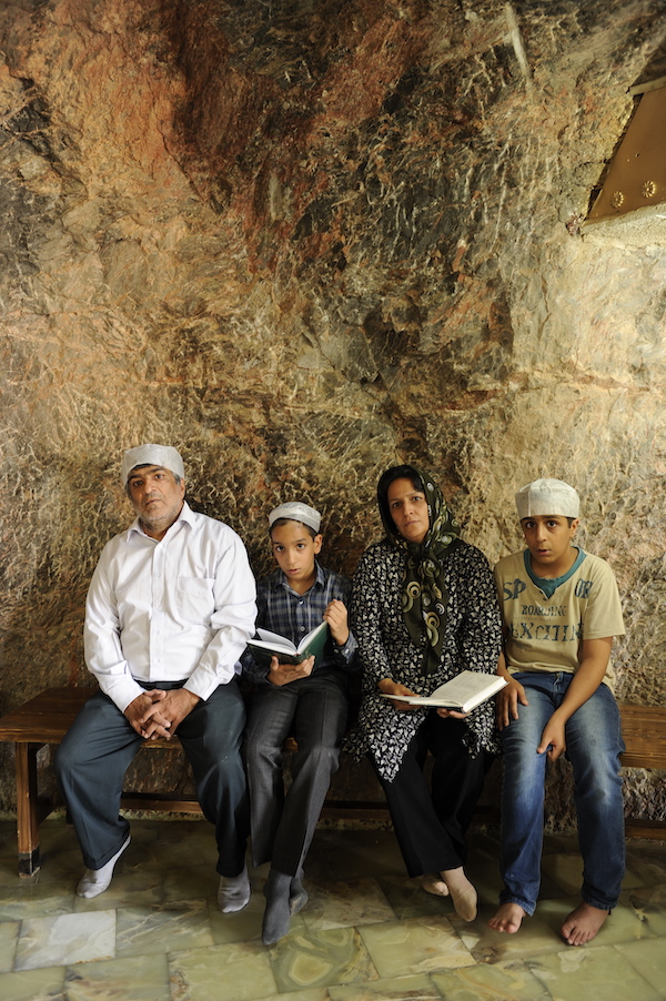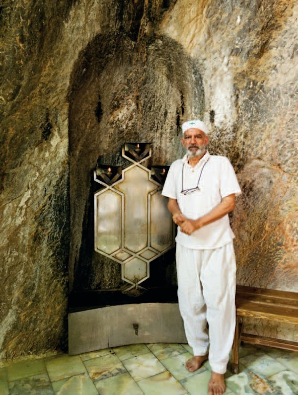 看管火庙的老人沙哈德来自亚兹德,每两周轮换。他白衣白裤白帽,前来为我们打开火庙大门。水从岩洞顶上滴落,人们将这水当作圣水接回去。不熄的圣火靠着岩壁,在一个颇隐秘的金属柜中燃着,一灯如豆。