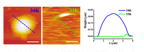 研究人员还采用一台低温原子力显微镜对h-BN表面气泡进行测量,发现原先饱满的气泡在温度从34 K降至33 K的瞬间会突然消失,这一塌缩/膨胀过程可随降温/升温过程反复出现。该转变温度与氢气的液化温度点(33.18 K)一致,也间接证明了h-BN气泡中确为氢气。