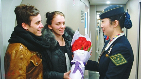 记得那是四月阳光明媚的一天,由太原南开往运城北的D5303次列车迎来13名英国旅客去平遥古城旅游,他们是一个大家族,没有跟着导游,座位号也没有买到一起。上车时碰到在车门口立岗的我,担心有语言障碍,一名叫杰克的先生双手比划,尝试着跟我表达他们的意思,没想到我能听懂而且还能用英语跟他交流,他很高兴,连忙点头称赞。我迅速为外国友人调整好座位,为他们介绍了车上的设备设施。后来我了解到他们来自3个家庭,带着孩子来感受中国著名四大古城,我把制作的平遥古城各个景点的英文图册拿给他们看,让他们提前了解线路,选择要去的景点,既解决了语言不通的尴尬,也节省了好多没必要浪费的时间,他们很是感动,对我们的服务赞不绝口。