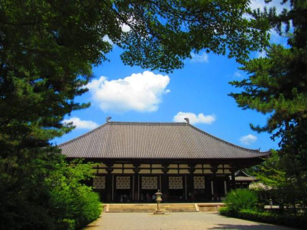 金堂耸立于古寺宽阔的院落之中。正面一排疏密有致的圆柱,承载着屋顶的重压。元禄年间大修,增加了天井的高度,致使大屋顶坡度变陡。然打破了匀称的屋顶,其雄浑反倒产生了别一种意味的强劲感。在金堂正前方的中门及左右回廊,原本围绕金堂形成一座庭院,一座左右均衡的伽蓝建筑。然而,自森本长老建立南大门,拆了中门和回廊,在南大门直接眺望,雄伟的金堂全貎尽收眼底。如此洗练、恢宏的景观,呈现了一种日本式的美。