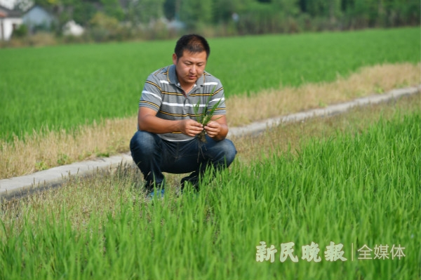 图说:85后“家庭农场主”陆云亭在田里察看。新民晚报记者 徐程 摄