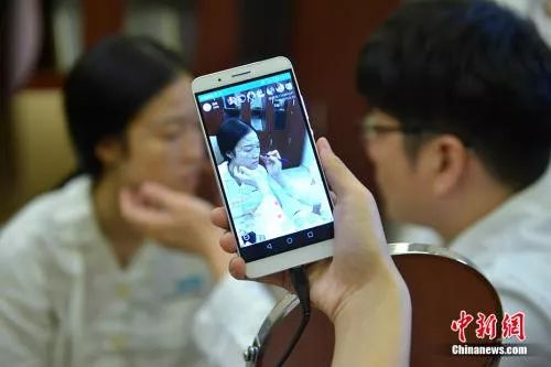 资料图 顾客接受整形手术时,朋友用手机直播 图文无关 中新社 张浪 摄