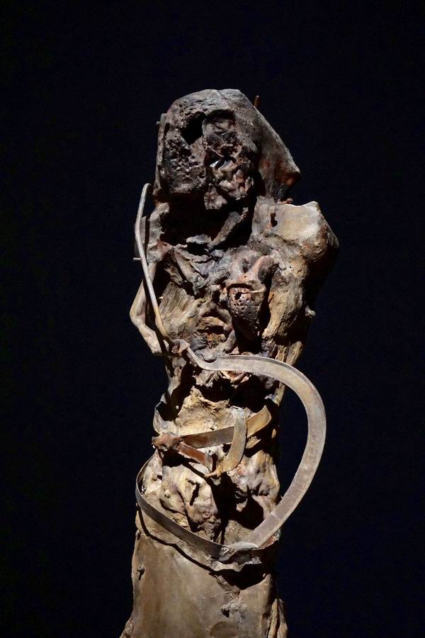 展览现场,首先吸引观众目光的就是高高矗立的《守夜人》系列雕塑,这是布里吉特·泰尔齐耶夫的作品。她于1943年出生于巴黎,母亲是画家兼钢琴家,父亲是雕塑家,曾是布德尔的学生。因此,她幼年沉浸在艺术世界,从父亲身上,她了解了石材切割的基础知识和该行业的秘密。随后进入了美术学院,在那里,她在雕塑家罗伯特·库蒂里耶的工作室学习。在生活艺术、当代舞蹈和非洲舞蹈的吸引下,她学习身体的姿势,并将学到的知识融入之后的雕塑词汇中。她常去国外,特别是在南斯拉夫,她与许多戏剧作家和导演在各种活动中有过合作。她于1970年回到巴黎,在雕塑家库泰勒的建议下重新开始雕塑并用硬木做材料。在抽象魅力的吸引下,艺术家继续追求她对形式和光的探索,其唯一目的是分析和表现人类的感受。