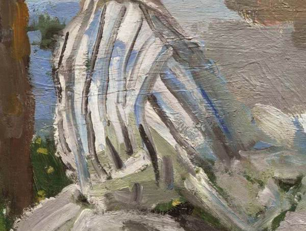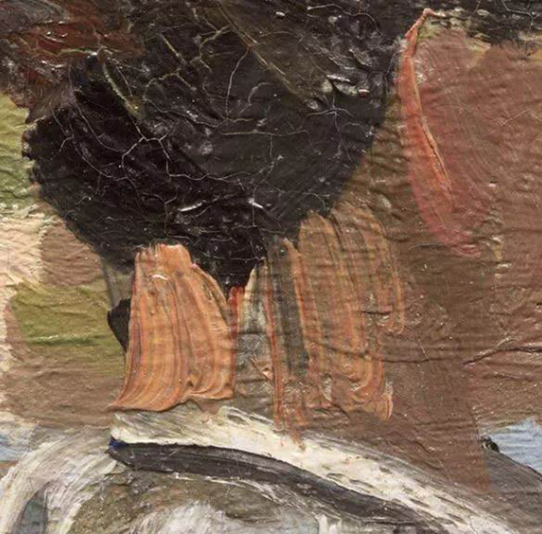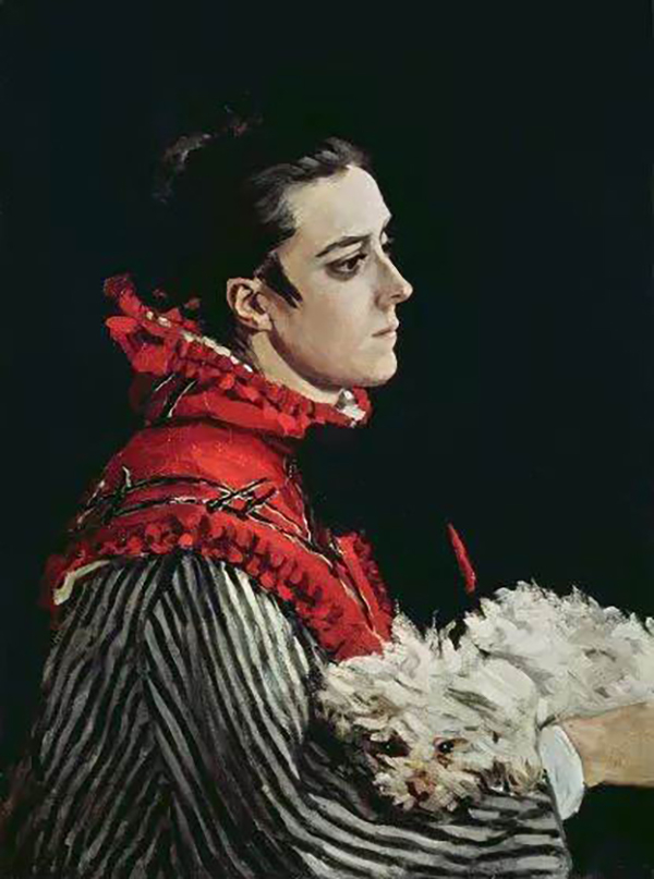 颈项后部有两条纵向的浅色线条,突显了她的的脖子,这是画家捕捉卡米尔侧影的独特角度。左边那条浅色的厚色块,看似一条装饰丝带,加上她粉红色、被夸大的耳朵,反应了莫奈用色块画出的卡米尔身影。卡米尔的形象近在咫尺,颠覆了人们遥想“水边丽人”这一主题的传统构想。