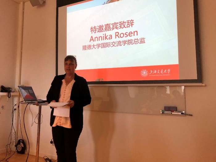 Annika Rosen介绍了瑞典以及隆德大学的概况,并代表隆德大学对上海交通大学瑞典校友会的成立表示衷心祝贺,表达了与上海交通大学展开更加深入合作的殷切希望。