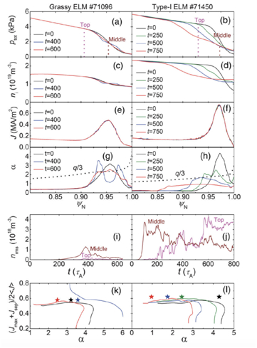 图2. BOUT++程序非线性模拟对比研究了常规大幅度ELM与Grassy ELM的台基动力学特征,揭示出台基分布演化过程中剥离气球模不稳定性边界的移动是Grassy ELM形成的内在动力学机制。
