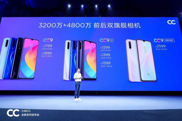 2019年7月2日, 小米集团在北京水立方召开小米CC 全新系列发布会,发布小米CC9、小米CC9e和小米CC9美图定制版三款小米CC系列手机。小米CC9是为年轻人重新设计的小米9,传承小米9旗舰工艺和核心体验,也是小米手机中首款采用前置3200万像素+后置4800万像素三摄旗舰相机的产品。小米CC9e是轻盈、小巧的精华版小米CC9,首发高通骁龙665处理器,相机规格与小米CC9相同,更适合单手操作。小米CC9美图定制版是为女生设计,100%美图算法的美颜拍照手机。