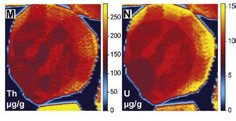 图1 Durango磷灰石晶体内部钍(左)和铀(右)含量的分布(Chew et al., 2016)