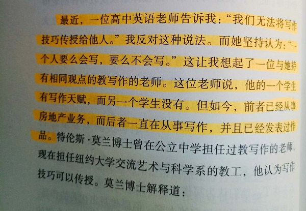 作者举了一个事例说明后半句的意思。一位患写作障碍一年的研究生谈到:“我会做其他一些事情来取代写作,甚至是做一些对社会有价值的事情,但写作障碍剥夺了做这些事情本该带给我的强烈的满足感和愉悦感。”言外之意,有了写作障碍,你可以转行,但你可能永远没那么开心了。看到这里真是毛骨悚然。